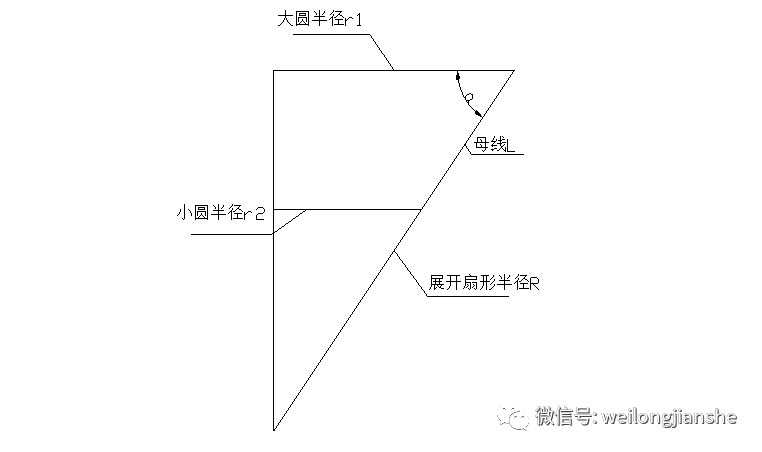 ② 爐殼如果是圓柱體只要知道圓柱體的高和底圓周長(zhǎng)***能求出展開(kāi)長(zhǎng)方形的長(zhǎng)和寬,這里不予以詳細(xì)介紹,主要說(shuō)一下錐臺(tái)展開(kāi),首先要找到圖紙給出的大圓半徑r1和小圓半徑r2還有母線(xiàn)長(zhǎng)L,如下圖: